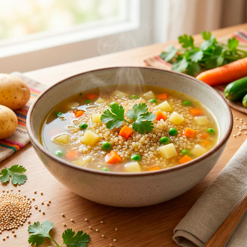 La quinua es el grano que conecta los Andes con la cocina contemporánea. En sopa, se transforma en un plato nutritivo, ligero y lleno de carácter, perfecto para cualquier día.